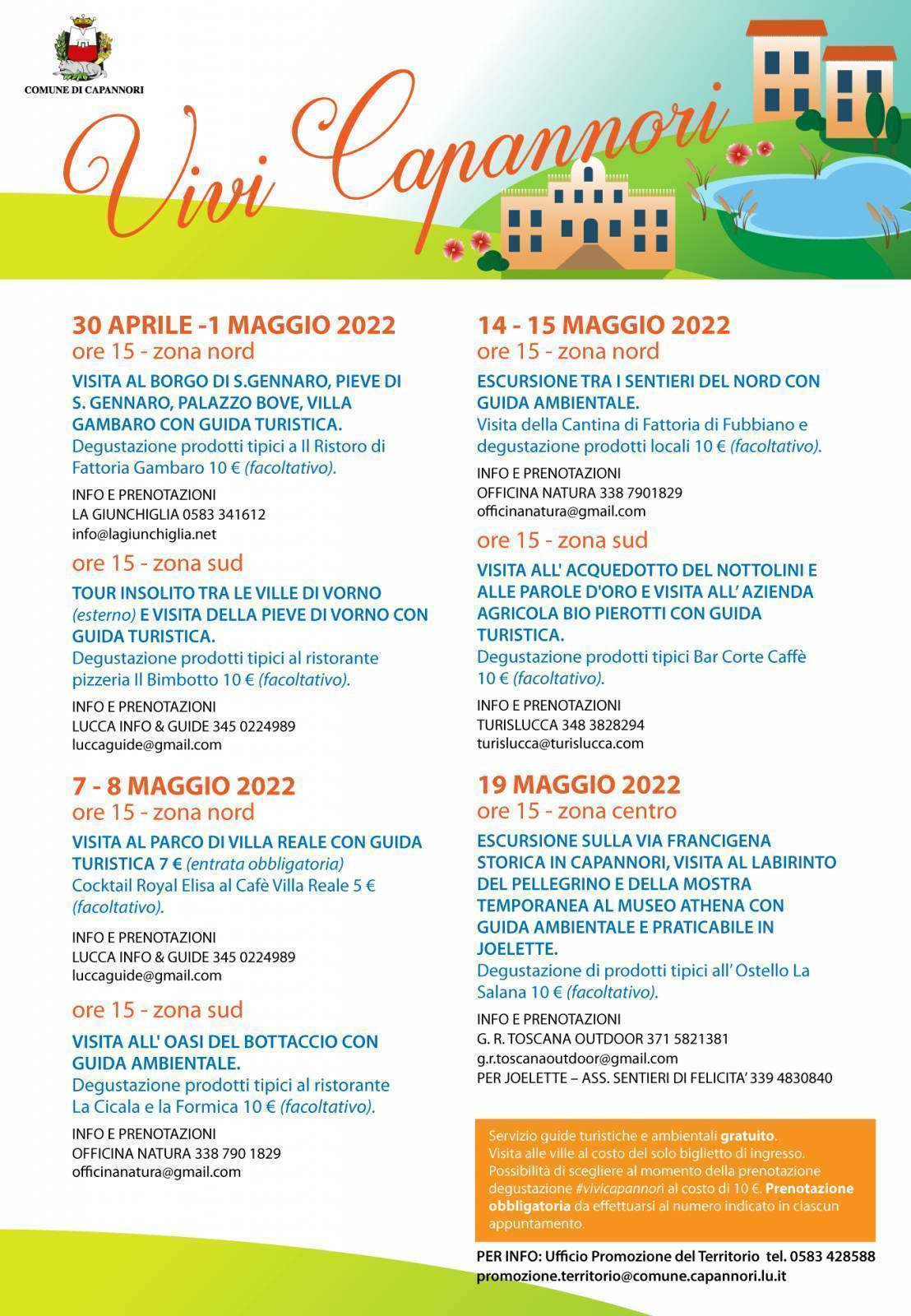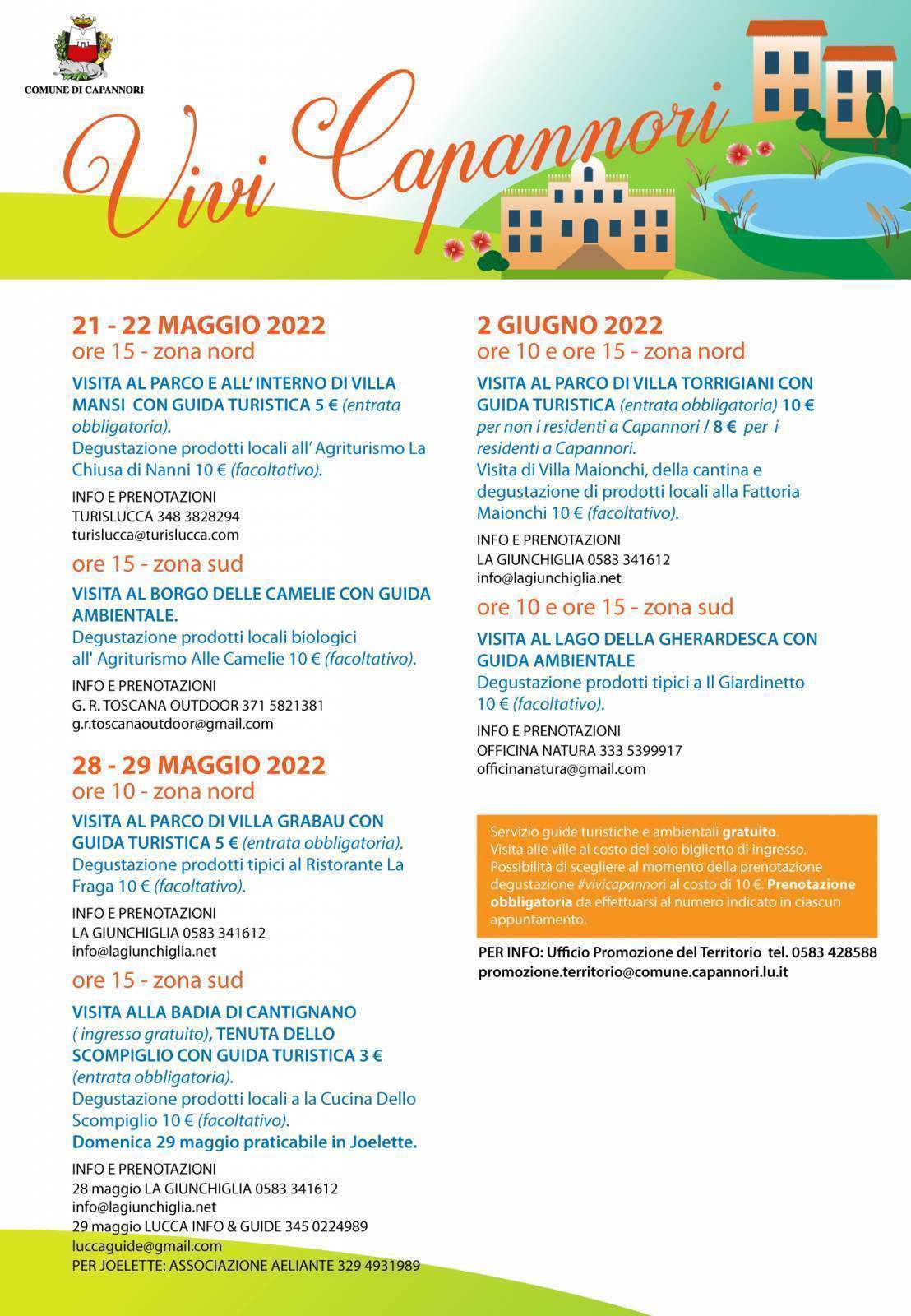 Prenderà il via sabato 30 aprile la manifestazione 'Vivi Capannori' promossa dall'amministrazione comunale per dare l'opportunità a cittadini e turisti di scoprire le bellezze paesaggistiche, naturalistiche e architettoniche di Capannori, valorizzando il turismo di prossimità. La manifestazione è in programma nei fine settimana 30 aprile-1 maggio, 7-8 maggio, 14-15 maggio, 21-22 maggio, 28-29 maggio e il 19 maggio e 2 giugno con visite ed escursioni di gruppo, con servizio gratuito di guida turistica e ambientale, ad alcuni dei luoghi più significativi del territorio comunale, tra cui ville, borghi storici, aree naturalistiche e pievi. I partecipanti avranno anche la possibilità di partecipare a degustazioni e aperitivi presso alcune strutture di ristorazione e bar segnalandolo al momento della prenotazione delle visite.