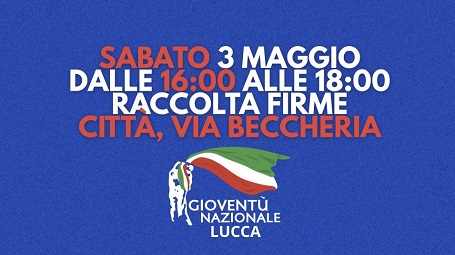 A commentare l'iniziativa è Diego Carnini, presidente del circolo di Gioventù Nazionale Lucca e consigliere comunale: "I recenti fatti di cronaca ci impongono, come giovani, di intervenire con responsabilità. Non possiamo restare in silenzio di fronte a questo degrado culturale e sociale. Questa petizione è un tentativo concreto non solo di proporre una soluzione, ma anche di sensibilizzare l'opinione pubblica. La scuola deve tornare ad essere un luogo di crescita e di identità, non un terreno fertile per la cultura della violenza". L'appuntamento è quindi per sabato 3 maggio in via Beccheria: basta maranza, basta baby gang. Per una Lucca più sicura, più forte, più nostra.