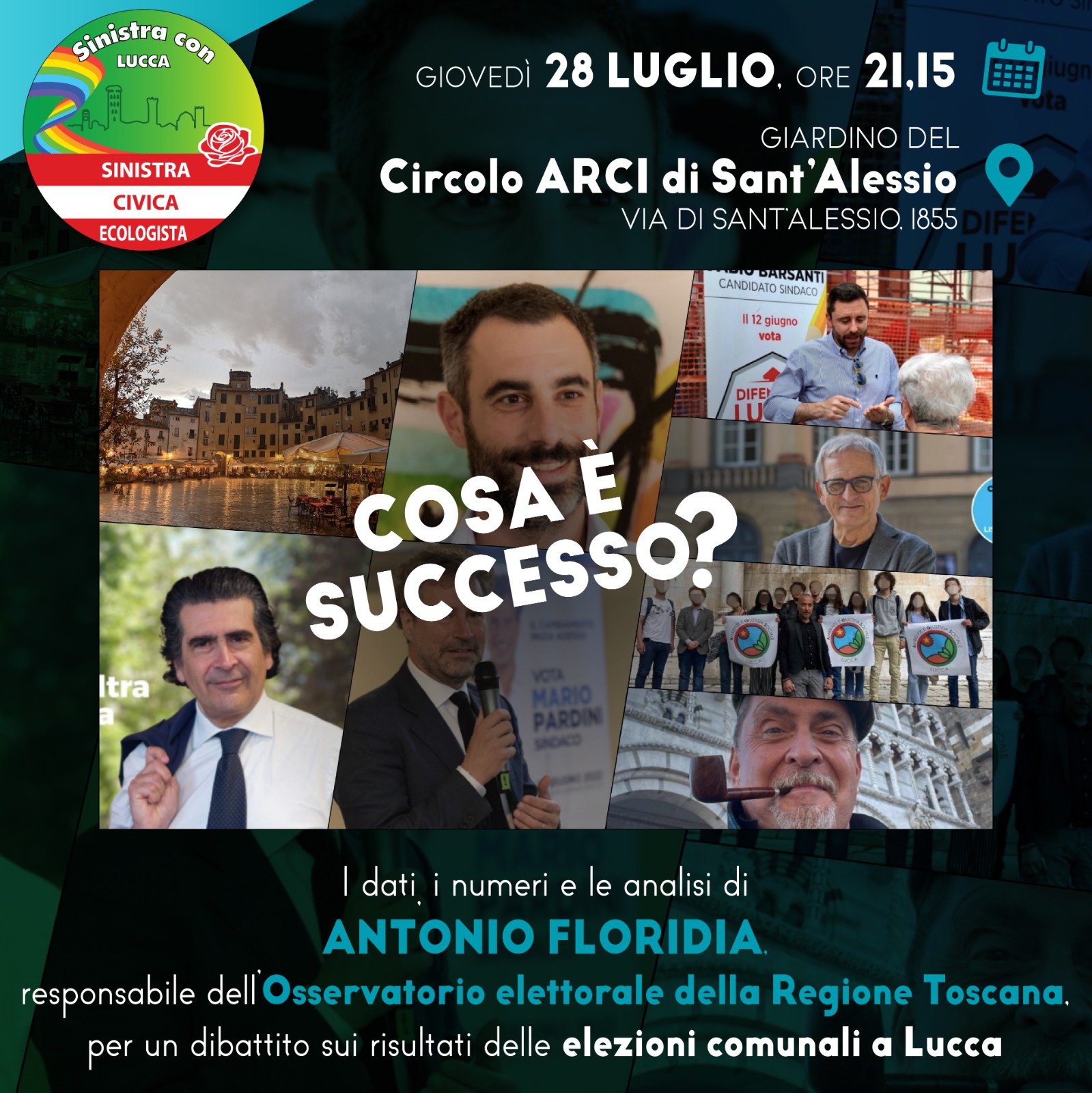 Si intitola "Cosa è successo?" l'iniziativa pubblica promossa dalla lista "Sinistra con Lucca – Sinistra civica ecologista", e in programma giovedì prossimo (28 luglio), alle ore 21,15, nel giardino del circolo ARCI di Sant'Alessio, in via di Sant'Alessio 1855.