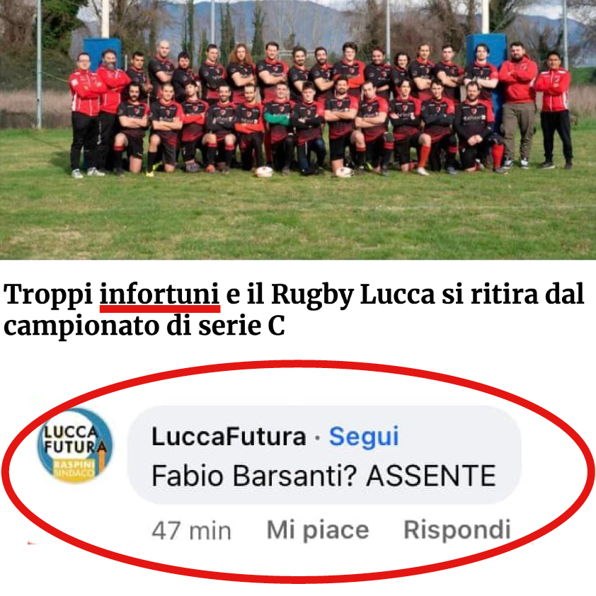 "Abbiamo scoperto che per il centrosinistra l'assessore allo sport avrebbe, tra i suoi compiti, anche quello di non far infortunare i giocatori delle squadre lucchesi. Una posizione imbarazzante ma emblematica della poca credibilità dell'opposizione". Difendere Lucca si riferisce al commento social fatto da "Lucca Futura", gruppo consiliare del centrosinistra, sul ritiro dal campionato da parte del Rugby Lucca. "Nel comunicato della società sportiva si motiva la rinuncia ai campionati con i troppi infortuni occorsi ai proprio giocatori, che renderebbero impossibile il prosieguo della stagione. La lista di centrosinistra commenta il fatto imputando la colpa all'assessore Fabio Barsanti, che sarebbe "assente"".