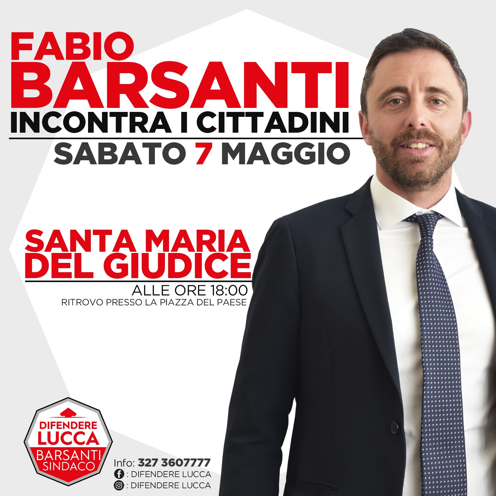 Continuano gli appuntamenti sul territorio del candidato sindaco Fabio Barsanti. Sabato 7 maggio incontrerà i cittadini di Santa Maria del Giudice alle ore 18:00 presso la piazza del paese. Presente il candidato Alberto Del Bianco della lista Difendere Lucca.