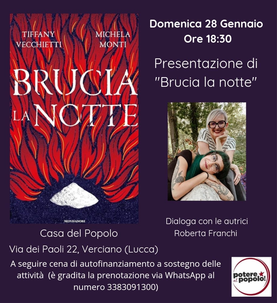 Domenica 28 gennaio alle 18,30 alla Casa del Popolo di Verciano Potere al Popolo avrà il piacere di presentare con le autrici Tiffany Vecchietti e Michela Monti il libro "Brucia la notte". Una presenza particolarmente significativa nella nostra città quella delle due artiste, che hanno scelto la Casa del Popolo per la presentazione dopo aver annullato la loro partecipazione all'ultima edizione del Lucca Comics in protesta col patrocinio dato all'evento dall'ambasciata d'Israele. Un libro dal titolo eloquente che parla di donne, di libertà e di rivoluzione, "un canto che non si arrende alla disperazione, un'ode al folklore della Romagna, un inno alla sorellanza e una sveglia tuonante che suona scandendo le parole "bisognerà ribellarsi sempre, continuamente"" per riprendere le parole usate dall'autrice Tiffany Vecchietti. La presentazione sarà seguita da una cena a prezzi popolari a sostegno delle attività svolte alla Casa del Popolo (gradita la prenotazione via WhatsApp al numero 3383091300).