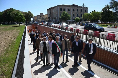 Questa mattina è stato inaugurato il nuovo sottopasso ciclopedonale che collega i percorsi intorno alle Mura di Lucca connessi con il centro storico e la stazione ferroviaria in piazzale Ricasoli. Oltre al sindaco Mario Pardini al presidente del Consiglio Comunale Enrico Torrini e all'assessore ai lavori pubblici Nicola Buchignani erano presenti il consigliere regionale Vittorio Fantozzi, gli assessori comunali Paola Granucci, Moreno Bruni, Remo Santini, la dirigente Antonella Giannini e i tecnici comunali, per l'impresa edile SAF il titolare Maurizio Bindi, gli ingegneri Paolo Barsotti, Enrico Favilla, Marco Pieri, l'archeologa Elisabetta Abela.