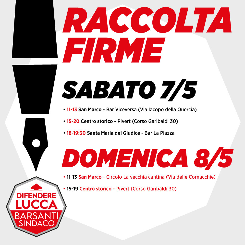 Sabato 7 e domenica 8 maggio Difendere Lucca raccoglie le firme per la lista a sostegno di Fabio Barsanti sindaco.
