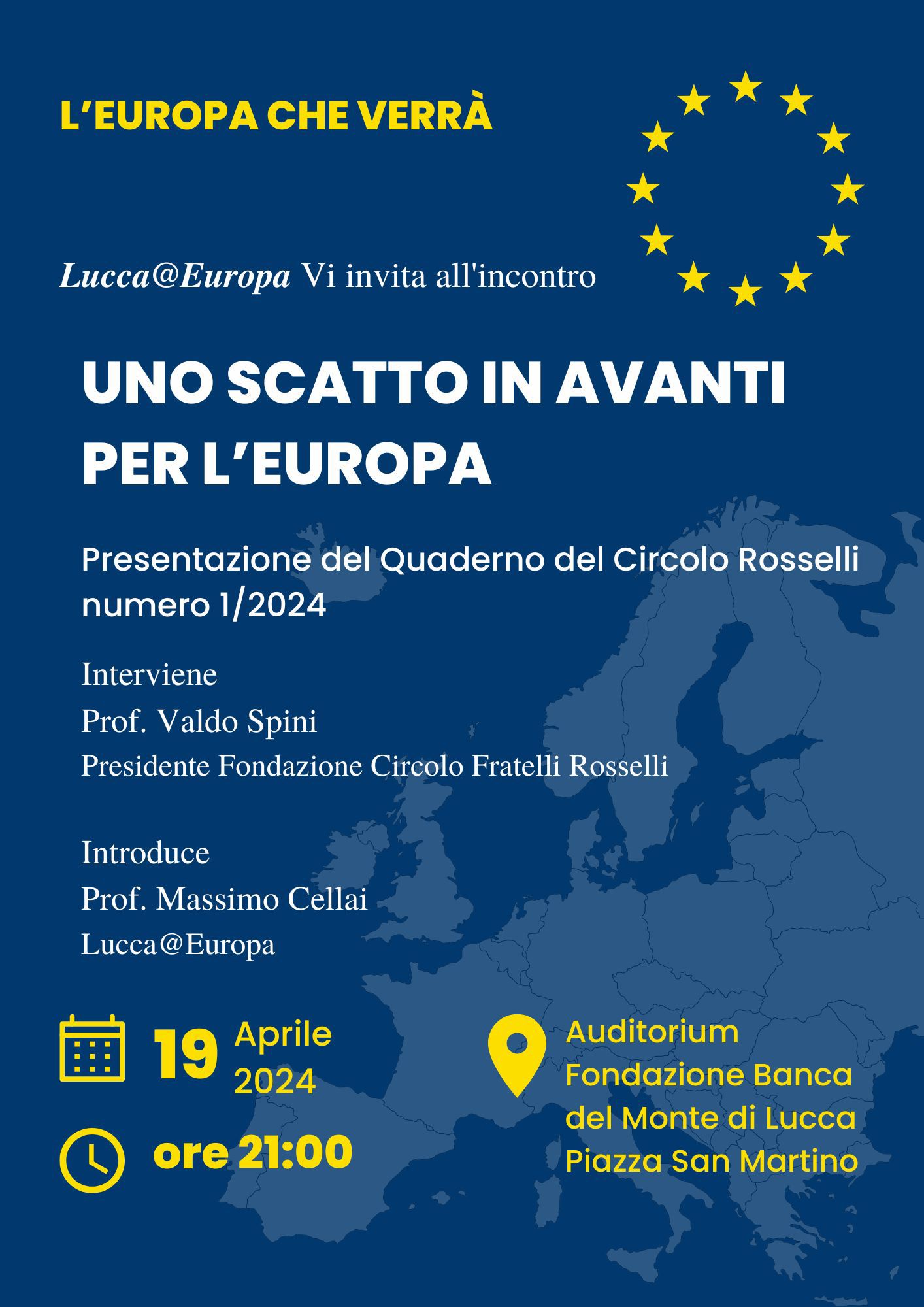 Elezioni europee e futuro dell’Unione, proseguono gli incontri di Lucca@Europa per sensibilizzare la cittadinanza sulla chiamata elettorale del 9 giugno. Il prossimo appuntamento, organizzato dal gruppo di impegni civico, si terrà venerdì (19 aprile) alle 21 nell'auditorium della Fondazione Banca del Monte di Lucca (in piazza San Martino). Ospite il Prof. Valdo Spini, direttore della rivista Quaderni del Circolo Rosselli e Presidente della Fondazione Circolo Fratelli Rosselli, che presenterà l’ultimo numero della collana, interamente dedicato all’Unione Europea, dal titolo Uno scatto in avanti per l’Europa. Ad introdurlo sarà il Prof. Massimo Cellai.