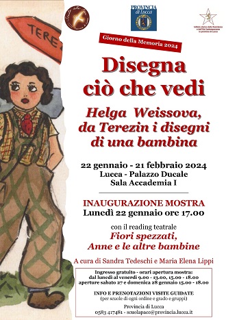 Partono con un doppio evento le iniziative della Provincia di Lucca e della Scuola per la Pace in occasione del Giorno della Memoria 2024. Il 22 gennaio, infatti, viene inaugurata la mostra «Disegna ciò che vedi - Helga Weissova da Terezin: i disegni di una bambina» allestita a Palazzo Ducale, nella Sala Accademia I, con un doppio appuntamento, uno dedicato alle scuole (alle 10) e uno aperto a tutta la cittadinanza alle 17.