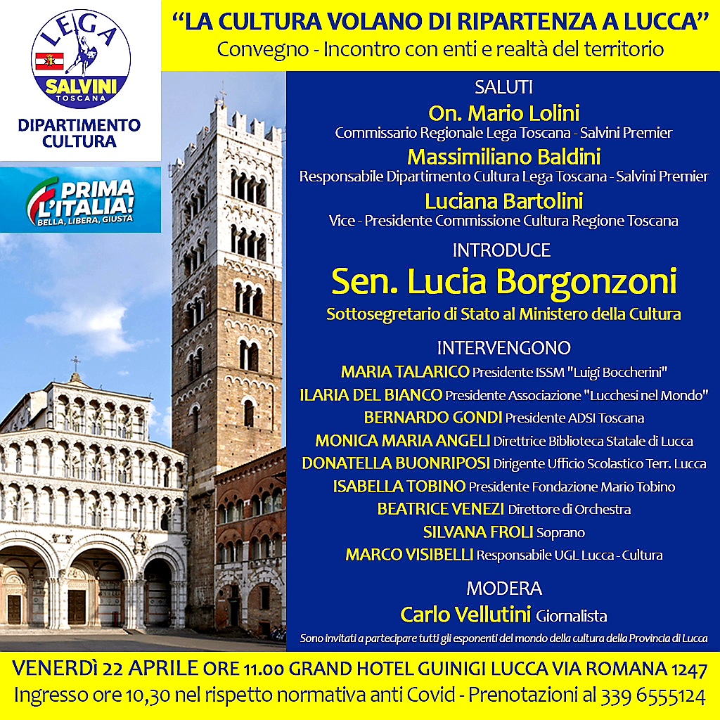 "La cultura volano di ripartenza a Lucca" sarà il tema intorno al quale si svolgerà il convegno-incontro fra il sottosegretario al ministero della cultura, senatore Lucia Borgonzoni, e numerosi esponenti delle realtà culturali del territorio che si terrà venerdì 22 aprile, a partire dalle 11 presso l'Hotel Guinigi, organizzato dal Dipartimento Cultura della Lega Toscana.