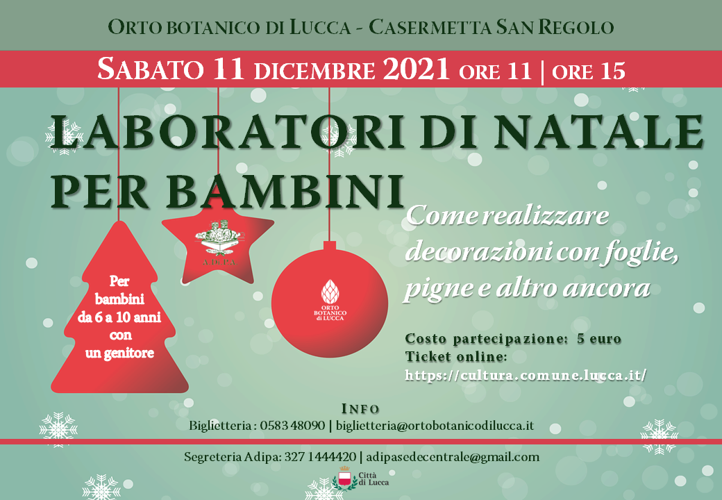 Un modo per festeggiare il Natale, per stimolare l’attenzione verso le piante anche attraverso la fantasia e la creatività. Natale all’Orto: sabato 11 dicembre alle ore 11 e alle ore 16, presso la Casermetta San Regolo, l’Orto botanico e l’associazione A.Di.P.A. organizzano divertenti attività laboratoriali per creare alcune decorazioni natalizie utilizzando pigne, rametti, foglie che i partecipanti potranno raccogliere nell’Orto. Un’esperienza consigliata per bambini tra 6 e 10 anni che prevede una breve visita all’Orto botanico a cui seguiranno i laboratori nella Casermetta San Regolo. In caso di maltempo la parte in Orto verrà annullata mentre rimarranno confermati i laboratori al chiuso. Le prenotazioni sono aperte fino a esaurimento posti su piattaforma di booking e ticketing online del Comune di Lucca tutte le informazioni su www.ortobotanicodilucca.it tel: 0583 48090 e-mail: