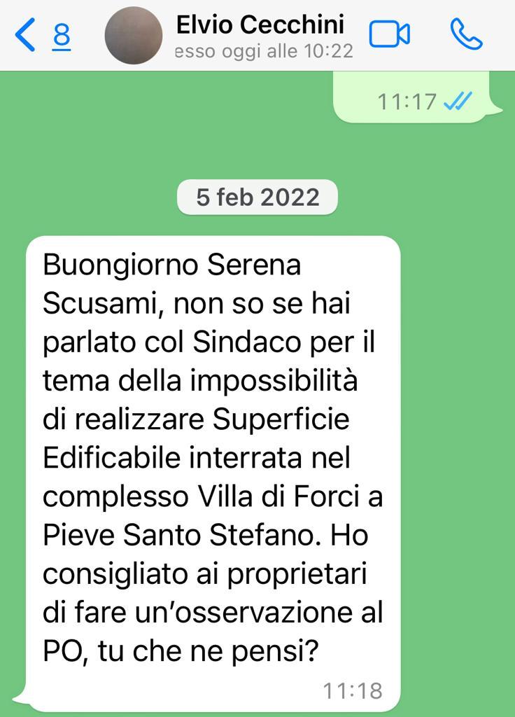 Mammini, infatti, ha ricordato di aver ricevuto un messaggio (nella foto), a febbraio 2022, dallo stesso Cecchini (in veste di architetto che si rivolge all'assessore all'urbanistica) in merito ad una delle principali operazioni immobiliari del momento riguardanti la ristrutturazione di una delle più belle ville storiche di Lucca, la Villa di Forci, recentemente acquistata da un magnate olandese (Robert Jan Van Ogtrop).
