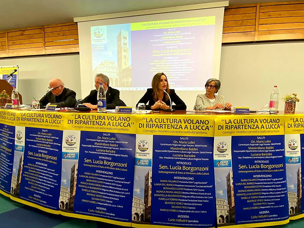"La cultura volano di ripartenza a Lucca" è stato il tema che ha animato gli interventi dell'intera mattinata, moderati abilmente dal noto giornalista Enrico Salvadori e che ha visto alternarsi sul podio Maria Talarico Presidente del Boccherini che da poco ha ottenuto la statizzazione, Ilaria del Bianco Presidente dei Lucchesi nel Mondo, Fabrizio Petri, in vece del Presidente Bernardo Gondi, in rappresentanza dell'Associazione delle Dimore Storiche Italiane, Monica Maria Angeli Direttrice della Biblioteca Statale di Lucca, Donatella Buonriposi Provveditore agli Studi di Lucca, Isabella Tobino Presidente della Fondazione Mario Tobino, il Direttore di Orchestra Beatrice Venezi che ha inviato un video dall'estero, la Soprano Silvana Froli e Marco Visibelli Responsabile UGL Lucca - Cultura, i quali hanno rappresentato all'esponente del Governo il significato, la storia ma anche le criticità, le problematiche e le aspettative che tali realtà ritengono doversi risolvere affinché sia davvero il settore della cultura a fare da traino per il rilancio del turismo e dell'economia di un territorio così importante come quello di Lucca.