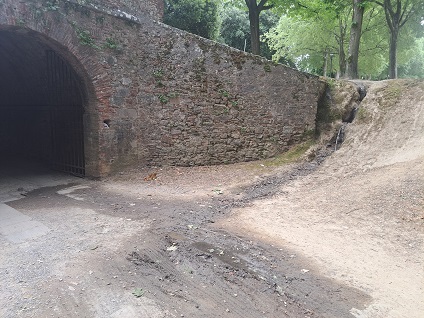 Da lungo tempo una griglia di scolo di acque piovane sversa liquami di fogna lungo la scarpata della discesa S. Salvatore, riversandosi sul camminamento di uscita delle mura alla casa del Boia.