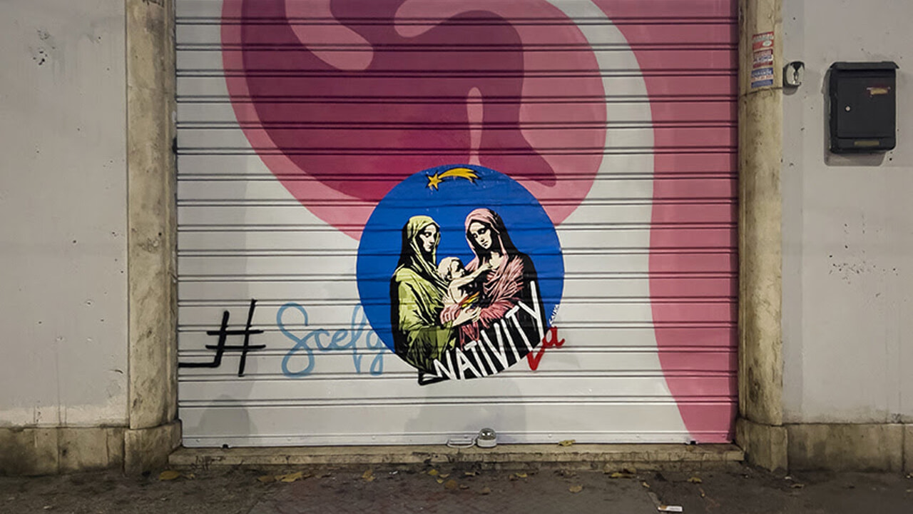 In una si vedono due Madonne accudire il Bambino Gesù, avvolto in panni arcobaleno, sopra la scritta "Natività". Nell'altra, San Giuseppe scolpisce una bara con scritto "Patriarcato".