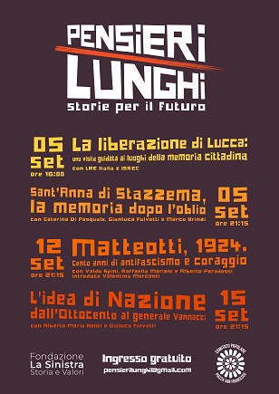 Giovedì 12 settembre, sempre alle 21, si ricorderanno i cento anni dall'assassinio di Giacomo Matteotti. Durante la serata dal titolo "Matteotti, 1924. Cento anni di antifascismo e coraggio" Valdo Spini, presidente della Fondazione Circolo Fratelli Rosselli e membro del Comitato nazionale per le Celebrazioni del Centenario della morte di Giacomo Matteotti, e Raffaella Mariani, presidente di Liberation Route Italia ed ex parlamentare della Camera dei Deputati, parleranno delle efferatezze del regime fascista a partire dalla tragedia personale e familiare di Giacomo Matteotti. In occasione dell'incontro sarà proiettato un video originale dell'epoca e l'attore Alberto Paradossi interpreterà alcuni brani degli scritti e degli interventi di Matteotti, come l'ultimo discorso dell'onorevole in Parlamento. L'incontro è introdotto dalla consigliera regionale, Valentina Mercanti.
