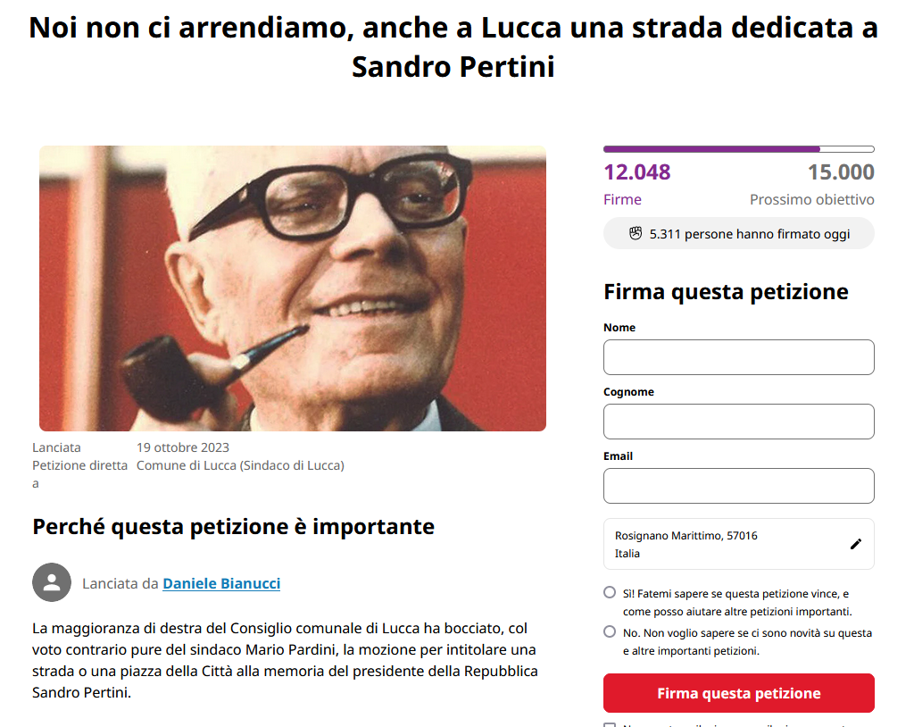 "Più di 12mila firme in una settimana. E' un successo la petizione "Noi non ci arrendiamo, anche a Lucca una strada dedicata a Sandro Pertini", lanciata dal consigliere comunale Daniele Bianucci all'indomani della sua mozione presentata in consiglio comunale per dedicare un luogo della Città alla memoria del presidente della Repubblica, e bocciata dal sindaco Pardini e dalla maggioranza di destra" a renderlo noto il centro sinistra lucchese con una nota.