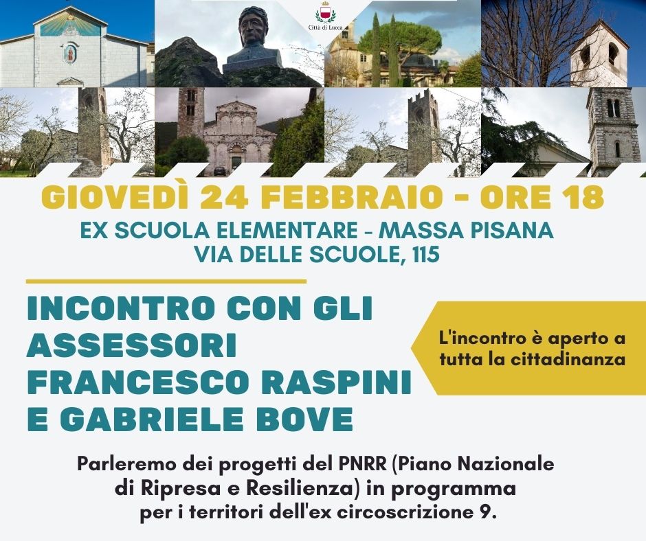 Un’occasione per raccontare ai cittadini i progetti del PNRR, il Piano Nazionale di Ripresa e Resilienza, e gli altri interventi in programma per i territori dell’ex circoscrizione 9: l’appuntamento è domani, giovedì 24 febbraio, alle 18, all’ex scuola elementare di Massa Pisana (via delle scuole, 115).