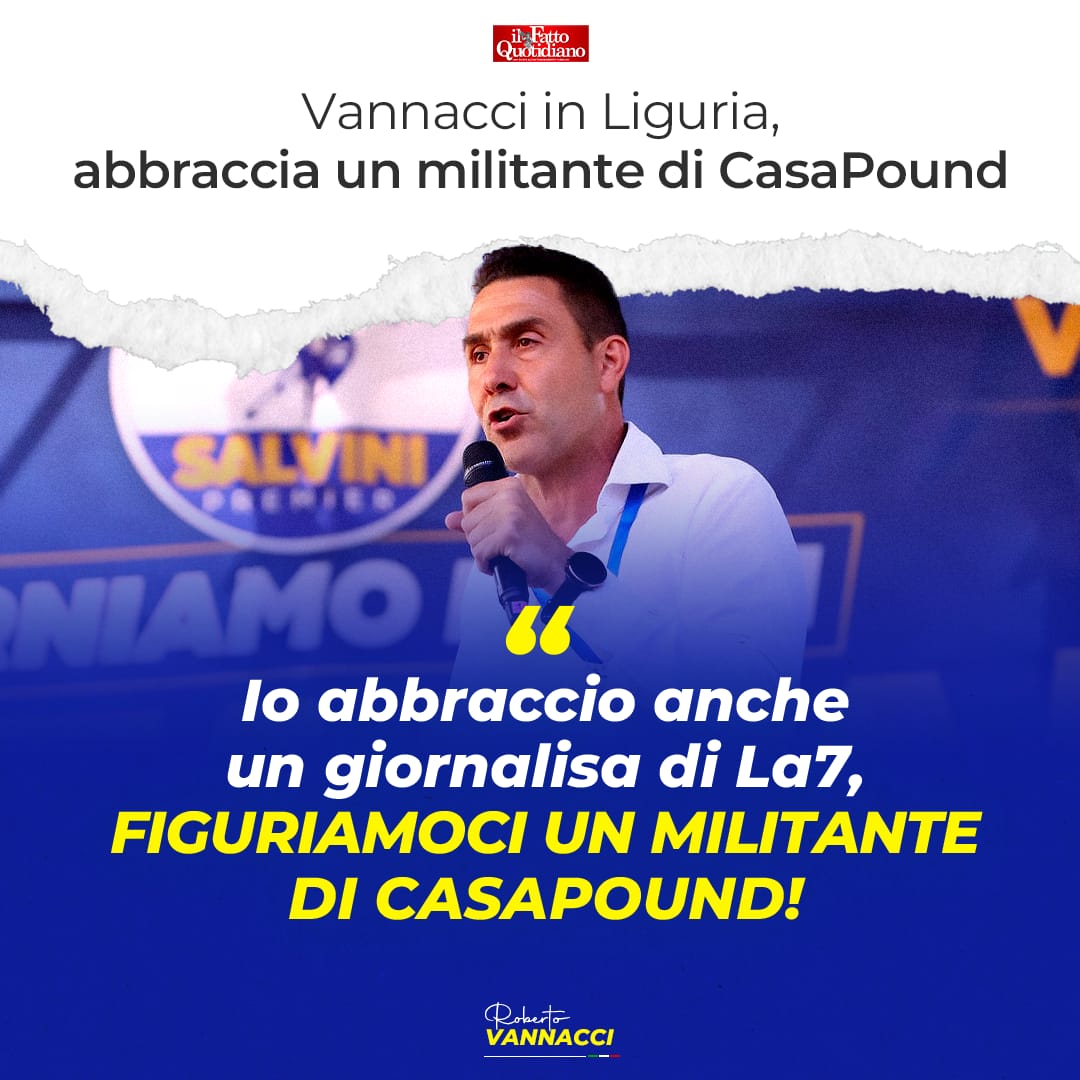 Quando questo giornalista del Fatto Quotidiano ha visto che rispondevo al saluto di un militante di CasaPound, e lo ringraziavo per avermi sostenuto durante le ultime elezioni europee, deve aver esultato sicuro del titolo che avrebbe trovato per il suo pezzo: “Vannacci in Liguria, abbraccia un militante di CasaPound”. Come se i militanti di CasaPound fossero contagiosi, appestati oppure puzzolenti. A questo giornalista e a tutti quelli che, come lui, non vedono l’ora di sparlare del generale Vannacci rispondo: io abbraccio anche un giornalista di La7, figuriamoci se non abbraccio un militante di CasaPound!