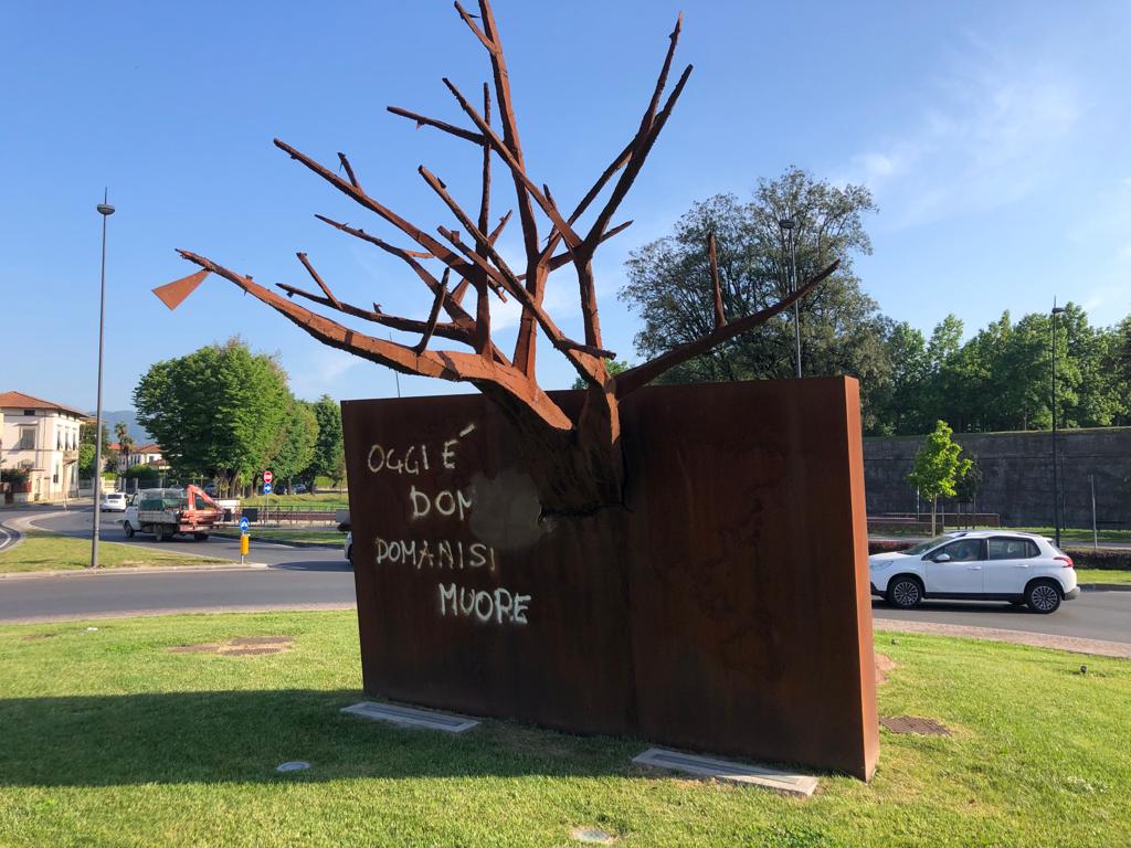 Quando si dice essere tempisti. Esattamente un anno fa il sindaco di Lucca Alessandro Tambellini, annunciò al mondo urbi et orbis che la schifezza di piazzale Boccherini ossia il monumento imbrattato al centro della rotatoria, sarebbe stato rimosso di lìm a poco dagli operai che erano già al lavoro o quasi. Era il 17 maggio 2021 e il monumento pagato 80 mila euro dai geni della stirpe della fondazione Cassa di Risparmio di Lucca, già orribile a nostro modesto avviso al momento della inaugurazione, dopo la deturpazione e il vandalismo posti in essere dallo stesso artista che aveva realizzato l'opera - forse pentito? - era diventato impresentabile, inguardabile, insostenibile.