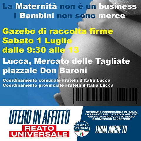 A Lucca appuntamento sabato 1 luglio al gazebo allestito al Mercato di Piazzale Don Baroni. Una raccolta firme per sostenere la proposta di legge di Fratelli d'Italia per rendere l'utero in affitto reato universale. A Lucca l'appuntamento di sabato 1 luglio dalle ore 9.30 è al gazebo allestito presso il mercato di Piazzale Don Baroni. Insieme a militanti, simpatizzanti e semplici cittadini ci saranno ad accoglierli il coordinatore comunale di Lucca, il coordinatore provinciale, i consiglieri comunali e assessori di Fdi del comune di Lucca il consigliere regionale e parlamentari Fdi eletti nel territorio.
