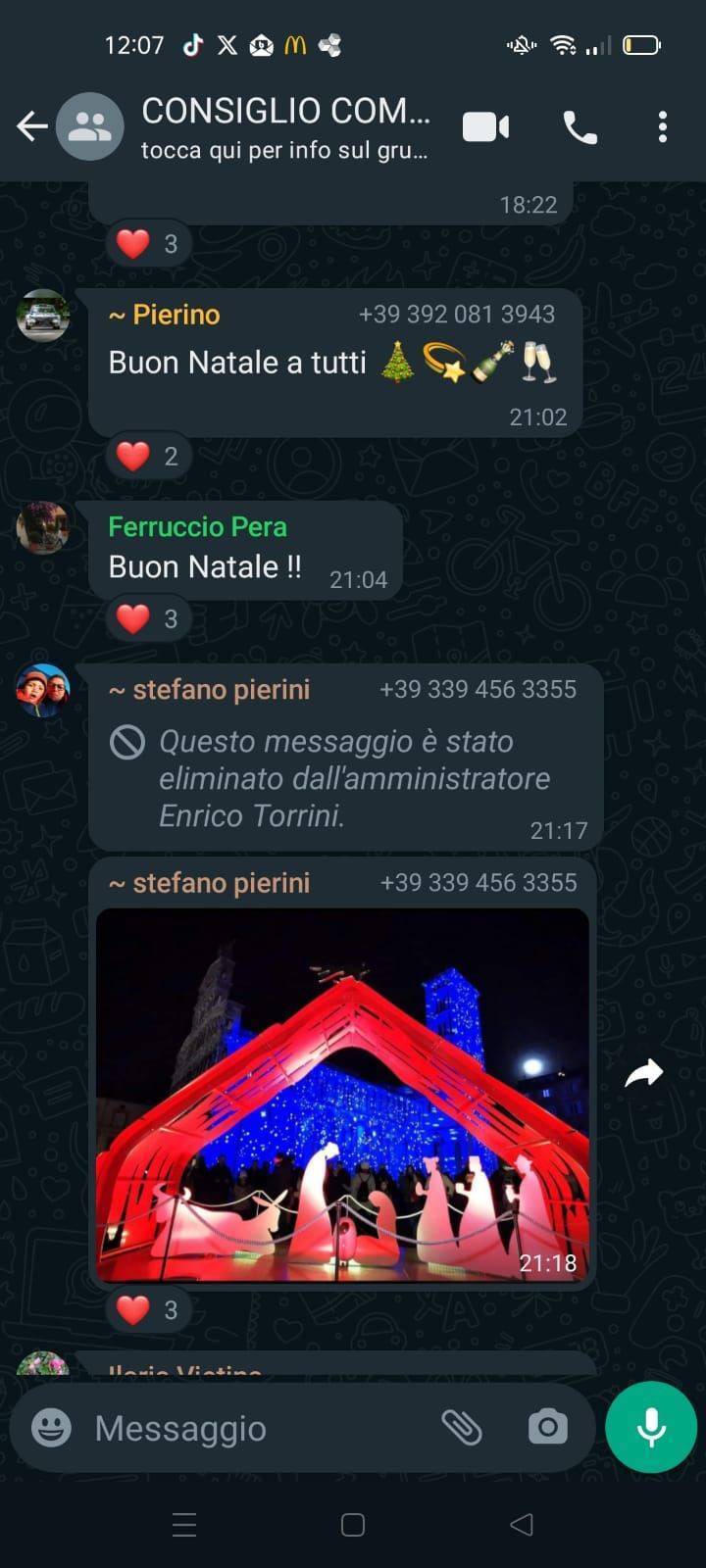 La sera del 24 di dicembre alle ore 21.18 il consigliere Stefano Pierini di Lucca 2032 invia nella chat dell’interoconsiglio comunale, fino a quel momento animata solo dai consueti auguri di Natale, il seguente messaggio: