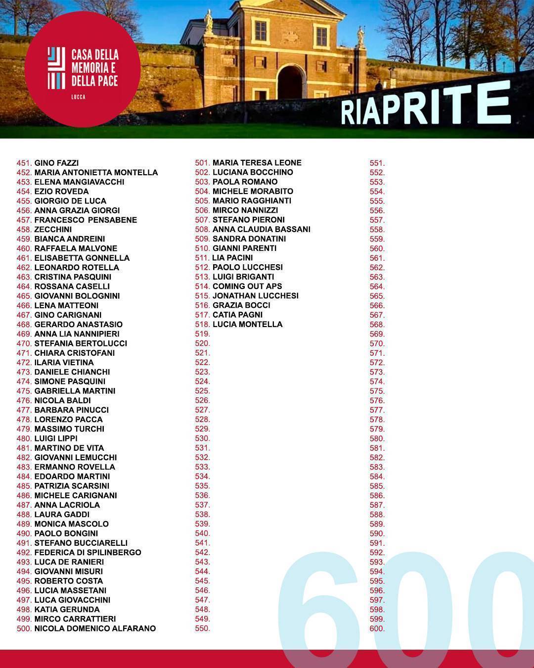 Tra le firme raccolte, quelle di intellettuali, scrittori, politici e personalità della cultura cittadina. "Siamo al momento decisivo. Abbiamo atteso per 9 mesi con garbo e rispetto verso il sindaco e l'Amministrazione comunale. Ora è arrivato il momento di un chiarimento: sia data alla Casa della Memoria e della Pace la possibilità di riprendere al più presto le sue attività affinchè i cittadini e le cittadine lucchesi tornino ad avere un luogo pubblico in cui incontrarsi, condividere saperi e memorie, costruire insieme percorsi di Pace."