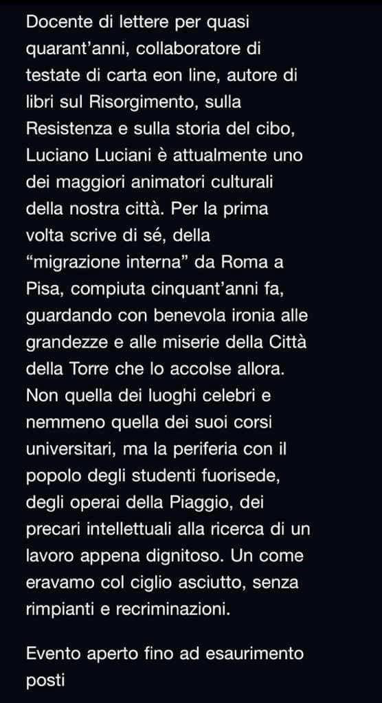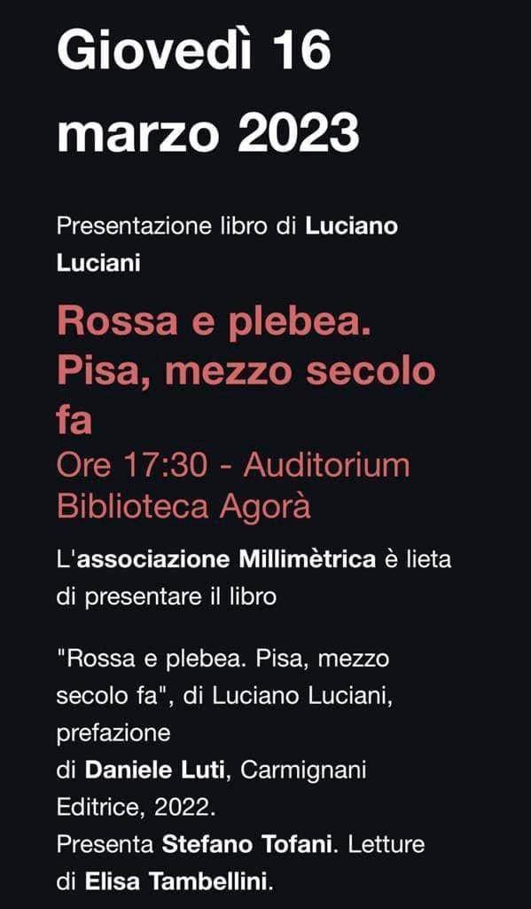 Che la mano sinistra non sa quello che fa la destra. All'Agorà, infatti, il primo marzo hanno inviato a tutti gli iscritti nell'elenco la newsletter contenente gli eventi del mese di marzo 2023. E, guarda caso, il 16 marzo era prevista, annunciata e stampata proprio la presentazione del libro "Rossa e plebea" di Luciano Luciani. Fatto sta che inspiegabilmente, almeno per noi profani, al posto della presentazione sono state inserite le prove di uno spettacolo dell'Associazione musicale lucchese che aveva chiesto, telefonicamente, agli uffici dell'Agorà la disponibilità della sala ricevendo, non si sa bene perché, il via libera.