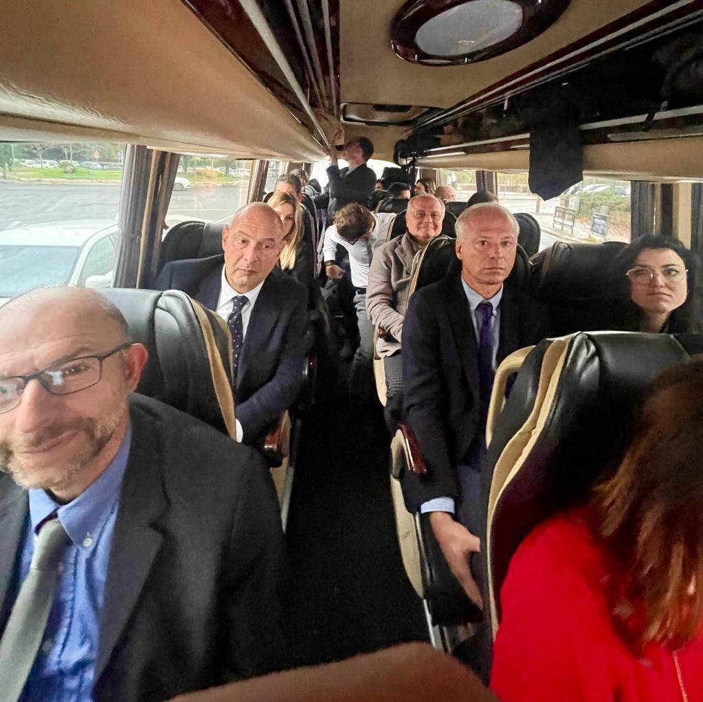 E menomale che non c'è anche l'assessore Fabio Barsanti di Difendere Lucca ed ex CasaPound ché, altrimenti, a Sinistra avrebbero gridato ad un tentativo di ripetere, sia pure con più di un mese di ritardo rispetto all'anniversario, la Marcia su Roma. Di assessori, però, sul pullmino decollato questa mattina poco dopo le 7 dal parcheggio di Mc Donald's a San Concordio alla volta della capitale, ce n'erano diversi, da Giovanni Minniti a Remo Santini, da Paola Granucci a Mia Pisano. Tutti, insieme, appassionatamente con i giornalisti delle varie testate lucchesi, on line, cartacee e televisive.