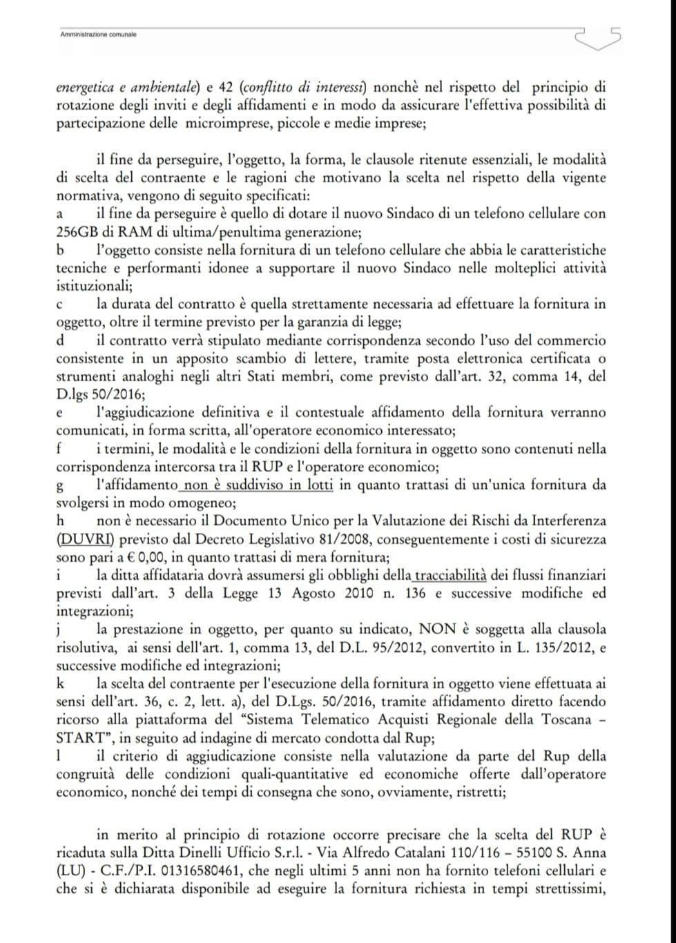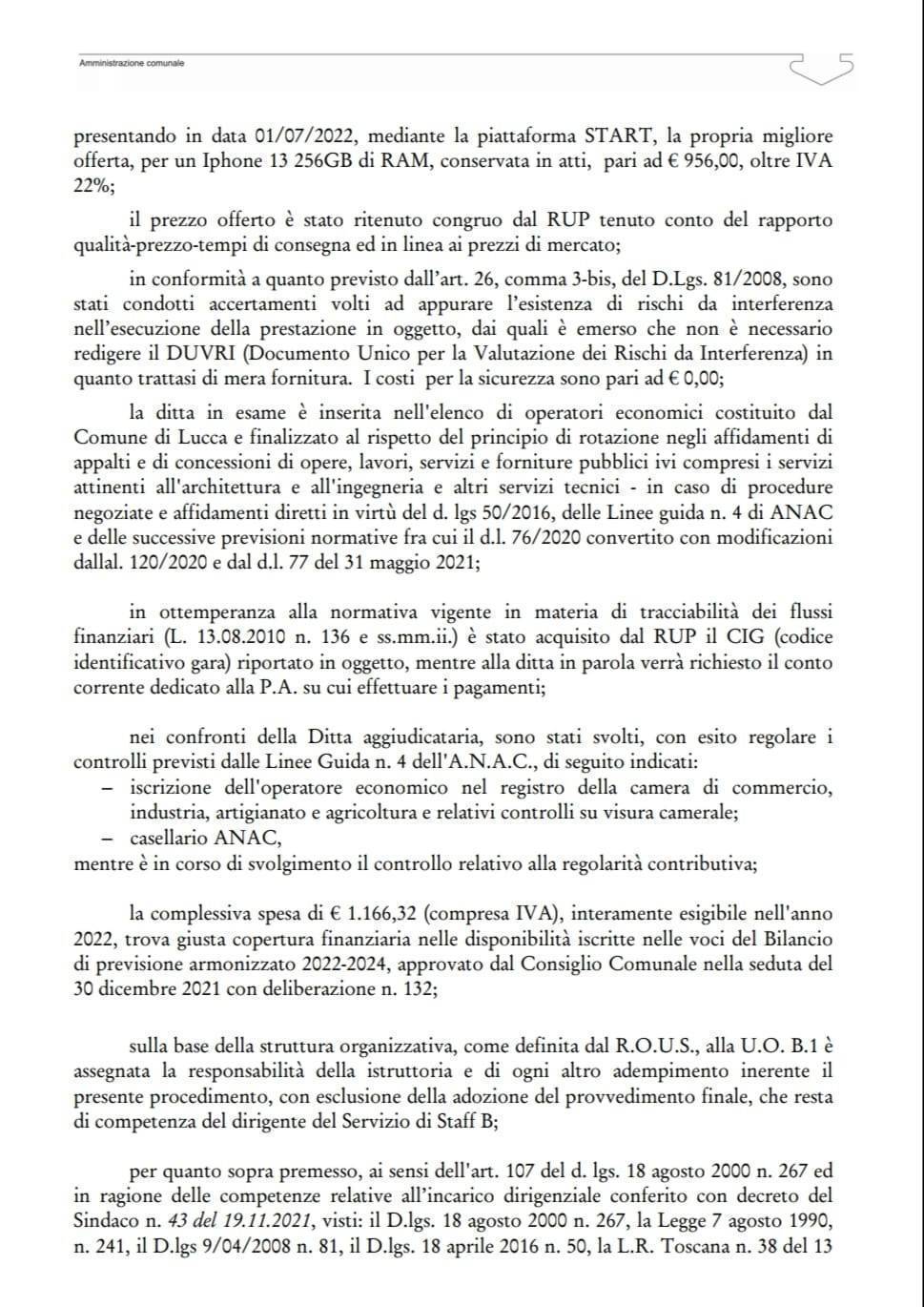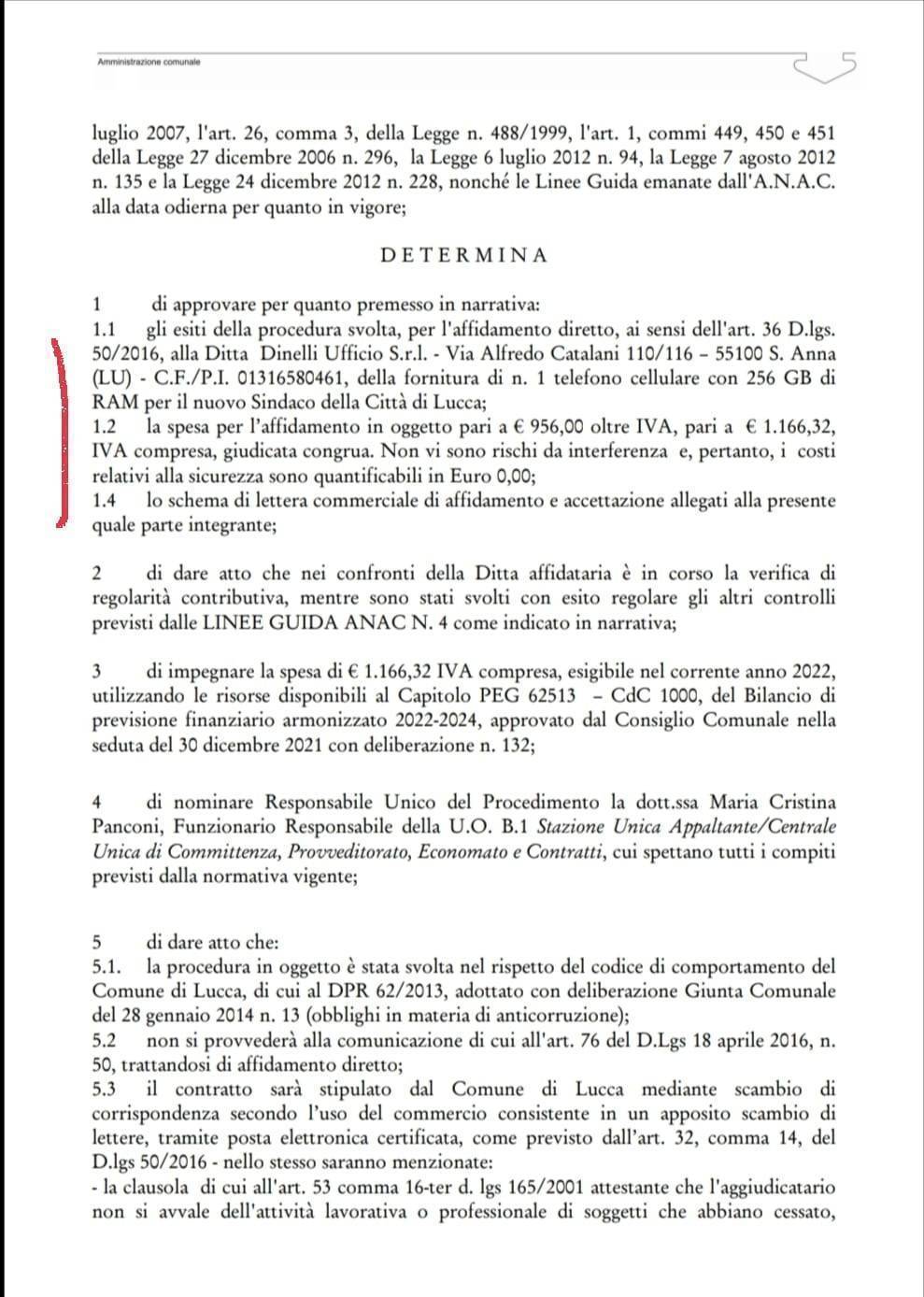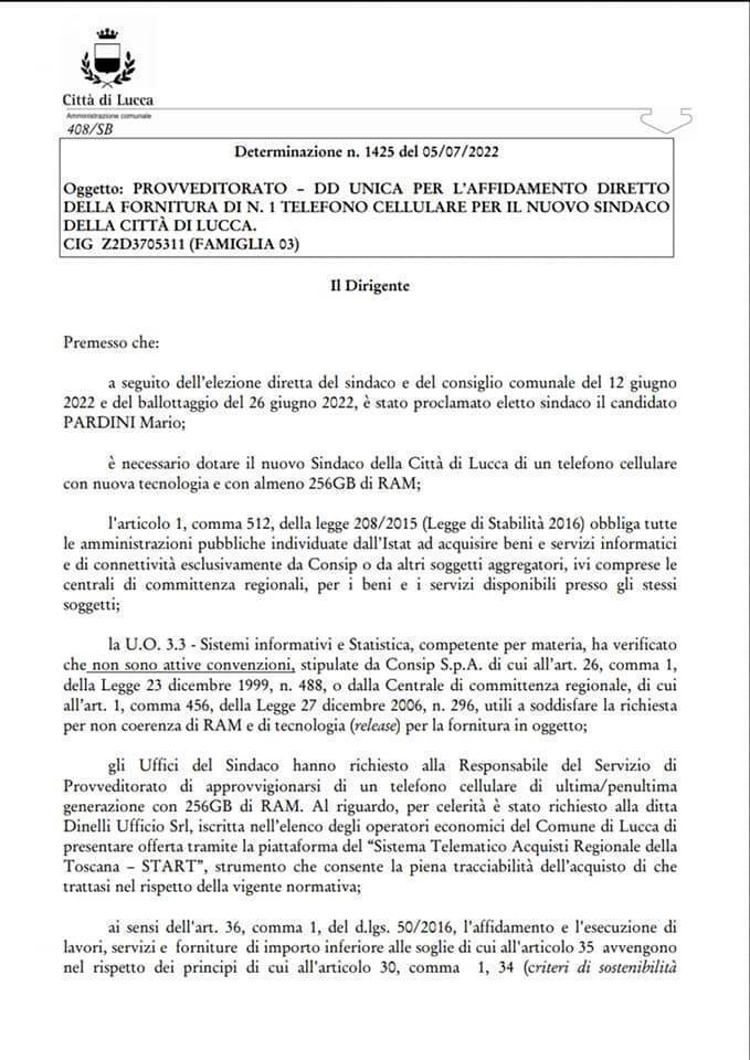 Un cellulare da 1.166,32 euro per il nuovo Sindaco! Tra i primi atti della nuova amministrazione c'è questa determina inerente l'acquisto, per le esigenze di servizio del neoletto sindaco, di un telefono cellulare da 1.166,32 euro. Lungi da me il voler fare populismo facile, ma penso che, quando si usano i soldi dei contribuenti, un po' di oculatezza in più non guasterebbe. Se tutti i nuovi componenti della Giunta intendessero dotarsi, per ragioni di servizio, dello stesso mezzo, avremmo una spesa per il Comune di oltre diecimila euro. Ci tengo, pertanto, ad invitare la nuova amministrazione ad una maggiore sobrietà. Siamo sicuri che in un momento storico così delicato per la cittadinanza, con una pandemia e una guerra in corso, non si potesse reperire sul mercato un cellulare altrimenti valido ad un prezzo minore?