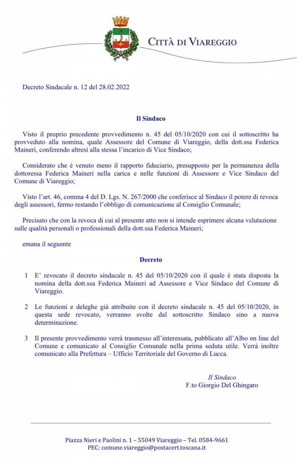 Sarà una coincidenza, per carità, ma noi, alle coincidenze, non sempre crediamo, soprattutto, quando si tratta di politica. Ieri sera il Pd viareggino, ossequioso alle direttive di Andrea Marcucci, Simona Bonafè ed Eugenio Giani, aveva inviato una sorta di ultimatum al sindaco di Viareggio Giorgio Del Ghingaro sia in merito agli attriti degli ultimi mesi con il vice sindaco targato Pd Federica Maineri, sia per quel che concerne l'eventuale e ventilata candidatura a Lucca.