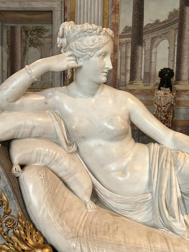 La notorietà di Paolina Bonaparte è indissolubilmente legata alla celebre scultura di Antonio Canova che la raffigura come Venere Vincitrice, opera commissionata dal marito Camillo Borghese, sposato a Parigi nel 1803, e oggi conservata presso la Galleria di Palazzo Borghese. La storiografia del tempo insiste prevalentemente sugli aspetti più mondani del suo carattere — capricciosità, frivolezza e libertinismo — che le valsero l’appellativo di “regina dei capricci.”