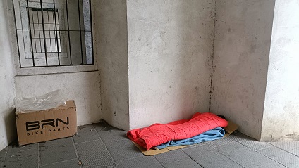 Siccome durante la giornata abbandona il suo giaciglio per tornarci di sera, torno con il piumone quando lui non c'è. La coperta è rossa, il colore dei giorni di festa e del Natale, è profumata fresca di lavanderia. Spero che quando la troverà stasera gli serva per alleviarlo dal freddo.