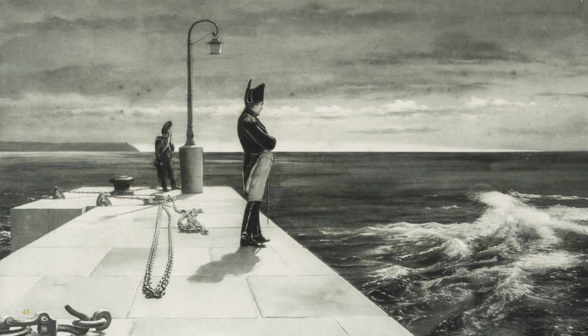Sconfitto il 18 giugno 1815 nella battaglia di Waterloo dalle truppe prussiane, olandesi e britanniche, comandate da sir Arthur Wellesley primo duca di Wellington, Napoleone tentò nel luglio del 1815 di raggiungere gli Stati Uniti ma, costretto a consegnarsi definitivamente agli inglesi, il 23 luglio dello stesso anno fu imbarcato sulla nave Bellerophon , con cui raggiunse Plymouth, sulle coste dell’Inghilterra meridionale, per poi partire il 7 agosto sul vascello Northumberland alla volta del suo esilio definitivo, la remota isola vulcanica di Sant’Elena nell’oceano Atlantico.