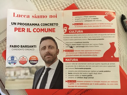 In questi giorni ho ritirato dalla mia cassetta postale il volantino elettorale per il sostegno della candidatura di Fabio Barsanti a Sindaco di Lucca. In tale foglio elettorale, con mia sorpresa, viene riportata (come evidenziato nell’immagine) la notizia che il Barsanti avrebbe “ottenuto il restauro del monumento a Dante”. Ora non so se tale affermazione è riferibile, essendo il Barsanti consigliere, a qualche attività svolta in Consiglio Comunale, anche se mi sembra di ricordare che una sua Mozione in tal senso, da lui presentata, sia stata bocciata dall’Assemblea Comunale, in ogni modo su tale vicenda potranno essere più precisi di me i suoi colleghi consiglieri.