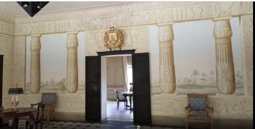 Lo stile egizio divenne così una sfaccettatura del grandioso stile impero che fu il marchio che Napoleone volle imprimere nella storia delle arti. A questo stile decorativo Bonaparte fu particolarmente affezionato, lo volle anche nella sua residenza della villa di San Martino all’isola d’Elba dove sulle pareti nella sala egizia è rappresentato un superbo paesaggio nilotico impreziosito da figure umane in abiti etnici sui cammelli, piramidi, isole ed elementi vegetali visibili attraverso un peristilio composto da colonne nel più puro stile egizio decorate con elementi vegetali stilizzati e raccordate da elementi architettonici completamente coperti da geroglifici.