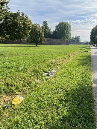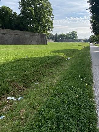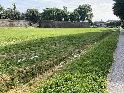 Tutti i cassonetti lungo le mura in Viale Giusti sono strabordanti di rifiuti, i netturbini anche quando li ripuliscono, lasciando tutto lo sporco a terra, che gira nei prati grazie al vento/animali.