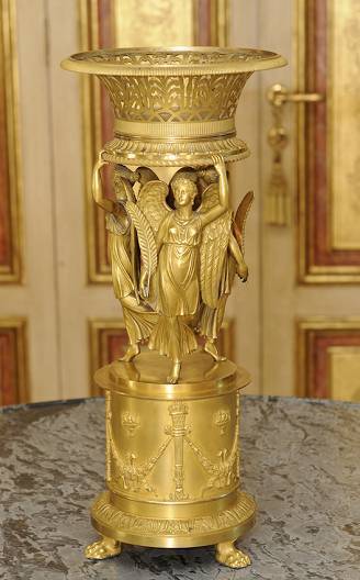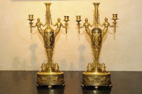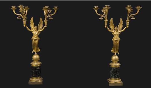 Uno splendido esempio di candelabri tipico del repertorio iconografico del periodo Impero è rappresentato dal modello a guisa di Vittorie alate. Tale tipologia è stata più volte ripresa dai bronzisti declinandola nelle più diverse forme. Questi manufatti venivano rigorosamente prodotti a Parigi in bronzo artisticamente cesellato e dorato al mercurio, tecnica prettamente parigina esportata in tutta Europa. Generalmente le vittorie venivano con la gamba sinistra arretrata, poggiante su una sfera sostenuta da fusto cilindrico, poggiante a sua volta, su di una base di forma quadrangolare sempre in bronzo dorato. Nelle mani comunemente portano due cestini, spesso decorati con motivi floreali, da cui dipartono i bracci terminanti con bobeches porta candele.