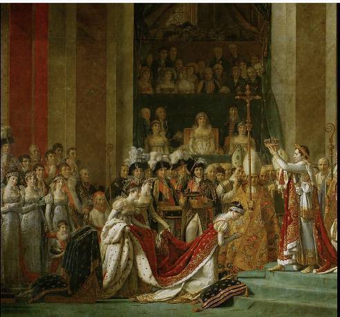 Il momento della nascita dell’Impero di Napoleone è stato ben rappresentato da Jacques-Louis David con la tecnica ad olio su tela. Considerate le imponenti dimensioni del dipinto, il pittore si avvalse della collaborazione dell’allievo Georges Roug. L’opera fu commissionata da Bonaparte nel 1804 e furono necessari tre anni per terminarla.