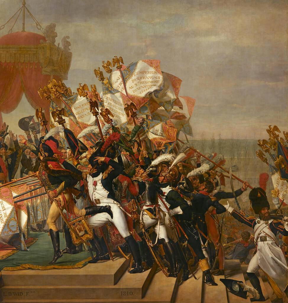 Parigi, 5 dicembre 1804. Tre giorni dopo la cerimonia di incoronazione, nel significativo scenario dello Champ de Mars, voluto da Luigi XV di Borbone per ospitare l’Ecole militaire per l’istruzione degli allievi ufficiali e per le manovre militari, Napoleone Bonaparte celebrò la cerimonia della distribuzione delle aquile al suo esercito. Riprendendo l’antica tradizione imperiale romana della consegna delle insegne alle legioni, Napoleone volle fortemente questa cerimonia per consolidare il legame di fedeltà tra la sua persona ed i suoi soldati in una cornice solenne dal valore simbolico pari a quello dell’incoronazione.