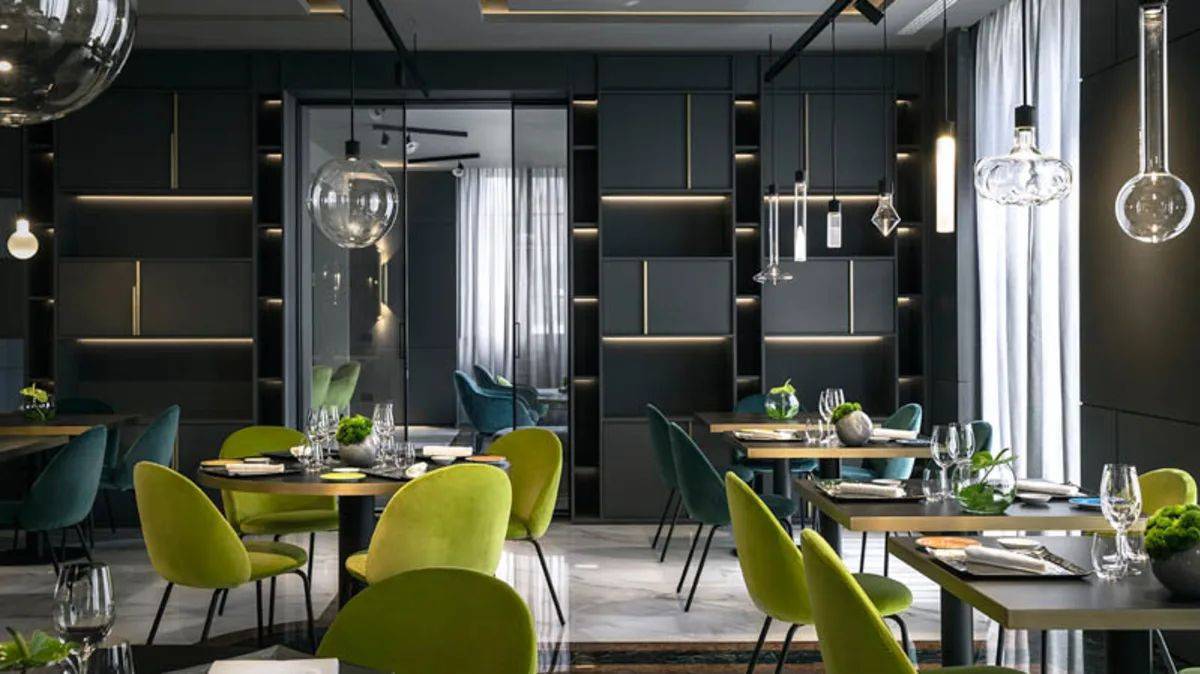 Il freddo grigio viene contrastato dalla radiosità dei quadri e dal colore verde delle sedie, tutto illuminato da lampade di diverse dimensioni che alternano la luce in modo delicato e preciso sopra ogni tavolo.