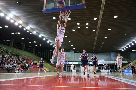 In una partita maschia e senza esclusione di colpi, il Basket Club Lucca conquista la sedicesima vittoria consecutiva e, con il punteggio di 94 a 85, liquida la pratica College Borgomanero senza mai andare in grosso affanno, tolti gli ultimi minuti del match quando i piemontesi si sono fatti pericolosamente sotto (- 5) ma, stringendo le maglie difensive, hanno saputo frenare il rientro degli ospiti, grazie anche all’esperienza e ad un tasso tecnico superiore che alla fine hanno fatto la differenza. Per il recupero della 27^ giornata del Campionato di Serie B Interregionale, al Palatagliate di Lucca va in scena la sfida tra i padroni di casa del Basketball Club Lucca ed il College Borgomanero. I ragazzi di coach Di Cerbo, che attualmente occupano la sesta piazza della classifica e che sono ormai quasi certi di disputare i play off, scendono a Lucca dopo due vittorie consecutive e vantano il miglior attacco del girone ma anche la peggior difesa. I biancorossi di coach Olivieri, primi della classe, cercheranno la sedicesima vittoria consecutiva per blindare il primo posto e portarsi a più quattro sulle rivali senesi Mens Sana e Costone, prima delle ultime due giornate di campionato. Per la palla a due coach Olivieri schiera Pichi, Valentini, Dubois, Drocker e Trentin. Per Lucca la aprono Trentin e Dubois, cui risponde Martino con un gioco da tre. A metà del primo quarto il punteggio è sul sull’11 a 7 per il BCL, grazie ai primi due punti di Drocker. Per il College sono Benzoni e Lastella a tenere la propria squadra ad uno scarto di un solo punto, che diventa però un vantaggio di più cinque, sempre con Benzoni, che ha fatto sentire in modo molto deciso il suo ingresso in campo. Una schiacciata ed un magistrale tiro dalla lunga, sulla sirena, di un caldissimo Gianni Dubois chiudono il primo quarto sul punteggio di 23 a 21 per il BCL, ma Borgomanero c’è. Con un Dubois ispirato e Benzoni fuori, dopo due minuti del secondo quarto, Lucca si porta al massimo vantaggio sul 33 a 23. E con una difesa aggressiva, necessaria contro l’esuberanza dei piemontesi, e un contropiede efficace, dopo 4’, i ragazzi di Olivieri sono avanti sul 38 a 23. Il BCL spende falli e Borgomanero è costretta dalla lunetta ma manca un po' di precisione (3 su 6) e così, a 2 minuti dalla sirena, grazie ad un Drocker chirurgico dalla distanza, Lucca si porta avanti sul 49 a 33. Con Pichi a segno dalla distanza, per i tre punti, e Borgomanero che non finalizza sulla sirena, si va all’intervallo lungo sul punteggio di 54 a 38 con un parziale di 31 a 17 per Barsanti e compagni. Da segnalare che, durante l’intervallo della partita, il presidente del BCL Matteo Benigni ha consegnato un riconoscimento a Matteo Brunori, presidente della Lucchese Calcio, neo promossa in Serie D e presente in tribuna con tutta la squadra assieme all’allenatore Sergio Pirozzi. Inizio di terzo quarto assai contratto per entrambe le compagni ma è Borgomanero che prova ad accorciare e, con un gioco da tre di capitan Gaiola, dopo 4’, si porta sul meno 11. La partita è fisica e giocata a ritmi alti da entrambe le squadre, tanto concitata quanto fallosa ma il BCL riesce a tenere Borgomanero a debita distanza e, alla fine del terzo quarto, il punteggio recita 74 a 61, con Landucci a segno da sotto canestro e Benzoni impreciso sul fil di sirena. Il quarto quarto inizia sulla falsariga dei primi tre, con gioco maschio, falli per entrambe le squadre e Lucca sempre avanti nel punteggio ma senza riuscire a dare lo strappo decisivo cosicché, dopo 4’, il punteggio è fissato sull’80 a 71 per i padroni di casa. Borgomanero si porta sul meno 8 a tre minuti dalla sirena e Dubois, con un imprevisto 0 su 4 dalla lunetta, permette a Borgomanero di rifarsi sotto sul meno 5. Ma è ancora Dubois, questa volta con mente fredda e mano calda, e con 45 secondi da giocare, che dalla lunetta mette a segno due tiri liberi che profumano di vittoria. Borgomanero sbaglia il possesso che poteva lasciare ancora una porta aperta al recupero e così, con Del Debbio preciso dalla lunetta tanto quanto Drocker, la partita si chiude sul 94 a 85, risultato che vale la sedicesima vittoria consecutiva per il BCL ed il vantaggio di 4 punti sulle immediate inseguitrici a due giornate dalla fine. Per gli ospiti ottime prove di Benzoni (18), Buttiglione (17) e capitan Gaiola (15). Per i biancorossi sono ben 5 i giocatori in doppia cifra e cioè Dubois (24), Drocker (21), Del Debbio (13), Trentin (12) e Pichi (10). Il Basket Club Lucca sarà di nuovo impegnato sul parquet del Palatagliate domenica 19 aprile quando a fargli visita, nell’ultima partita casalinga della regular season, sarà il Grantorino Basketball Draft.