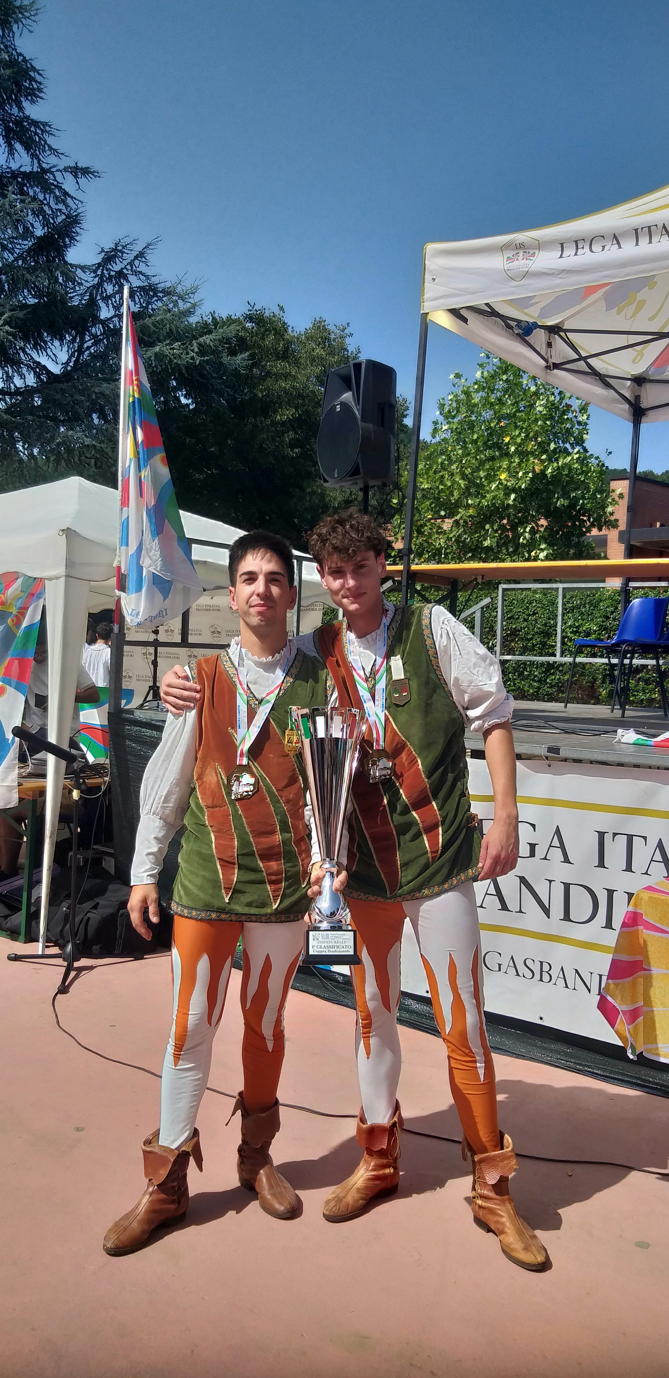 Nella seconda giornata di gare gli sbandieratori Brogi Matteo e Lucchesi Emanuele si sono presentati alla gara di COPPIA TRADIZIONALE con un esercizio di elevato valore tecnico eseguito magistralmente tanto da permettergli di conquistare il titolo di CAMPIONI D’ITALIA.