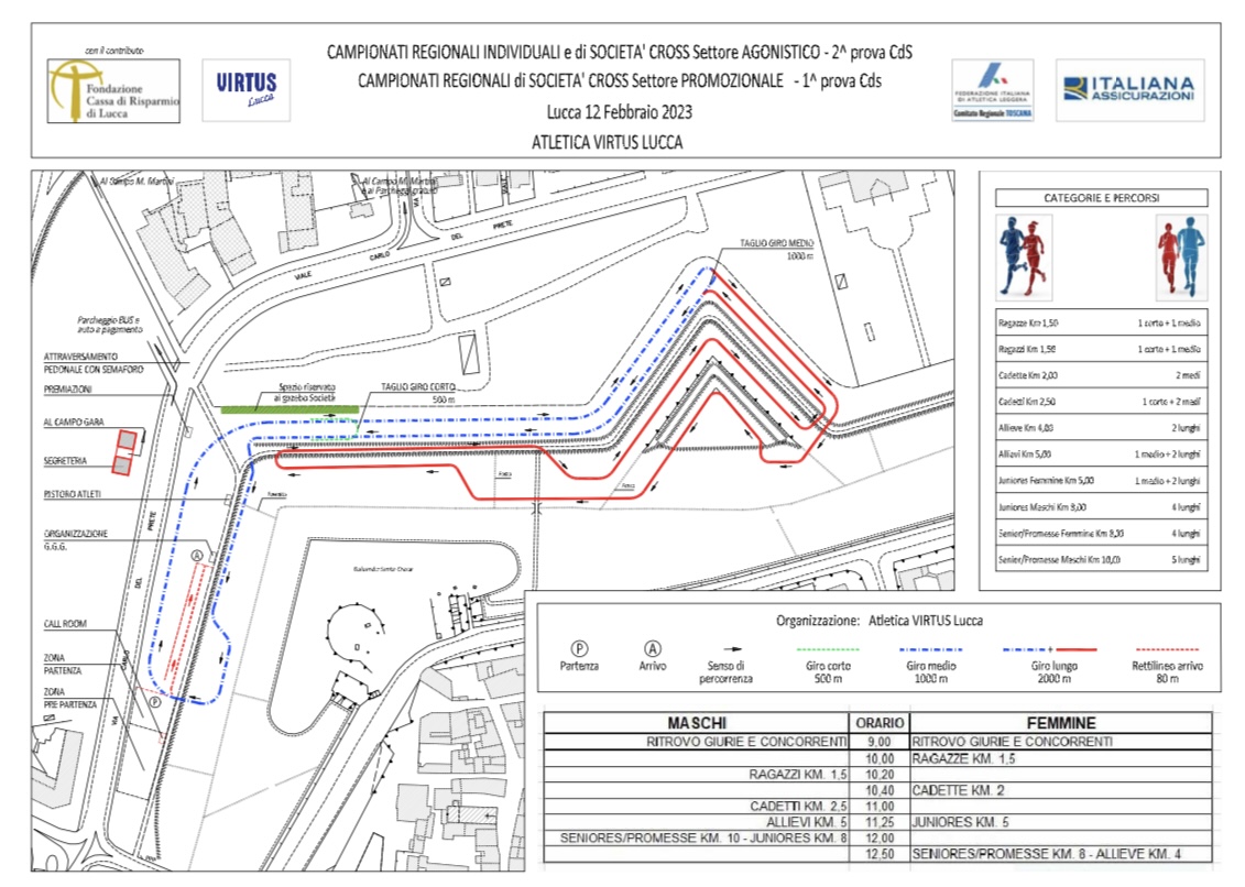 Oltre 900 atleti di sessanta differenti società si confronteranno nell’affasciante contesto lucchese, con le Mura cittadine a fare da sfondo alla competizione, che prenderà il via alle 10 con la gara delle atlete categorie Ragazze (1.5 km). Il programma prevede poi: alle 10.20 Ragazzi (1.5 km); alle 10.40 Cadette (2 km) e a seguire, alle 11.00, Cadetti (2.5 km); alle 11.25 Allievi (5 km) e Juniores femminile (5 km); alle 12.00 al via la gara Juniores maschile (8 km) e Seniores e Promesse maschile (10 km) per finire alle 12.50 con la gara Allieve (4 km) e con quella Seniores e Promesse femminile (8 km).