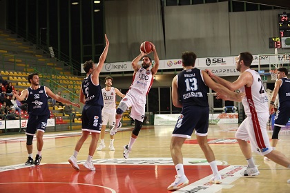 Olivieri sembra aver trovato la giusta combinazione per controllare la spinta di Quarrata, ma ancora a mettere in difficoltà la difesa biancorossa è Regoli per il 28/30, poi Dubois va al pareggio, Pierini da due ed ancora Dubois per il 37/33 di fine secondo quarto