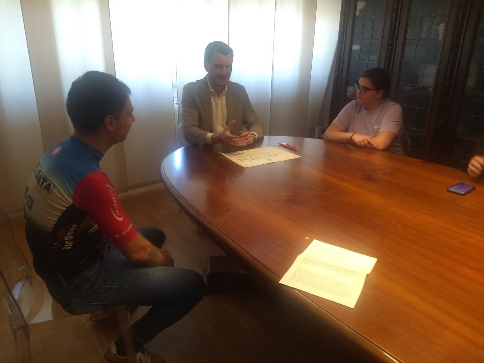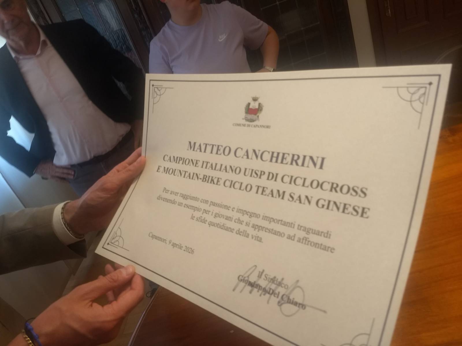 Un incontro piacevole e gratificante per Matteo Cancherini, portacolori del Ciclo Team San Ginese, premiato dal sindaco di Capannori Giordano Del Chiaro per aver raggiunto traguardi di rilievo che danno lustro alla comunità locale, dimostrando impegno, sacrificio e i valori positivi dello sport. Nel mese di gennaio di quest' anno a Pineto in provincia di Teramo si era riconfermato campione italiano Uisp di ciclocross ed il 24 maggio prossimo a Chieri è chiamato a difendere il suo titolo italiano anche nella mountain-bike di cui è detentore. La consegna dell' attestato di benemerito è stato un momento celebrativo di grande rilievo per l' atleta amatoriale condiviso dal presidente del Ciclo Team San Ginese Claudio Andolfi che tanto si impegna per mantenere la sua squadra fra quelle più vittoriose nel territorio comunale avendo segnato nel tempo imprese straordinarie come le vittorie nelle Gran Fondo più importanti d' Italia fra cui la Maratona Dles Dolomites e la Nove Colli. A ricevere l' atleta nella sala consiliare del Comune assieme al Sindaco Del Chiaro era presente l' Assessore allo Sport Gaetano Ceccarelli. Altri ospiti: l' Ambasciatore del Comune di Capannori Valter Nieri, il presidente della F.C.I. del comitato provinciale di Lucca Pierluigi Castellani e l' assistente tecnico dello stesso Cancherini alle corse, sua figlia Rebecca.