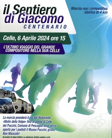 Sabato 6 aprile, con partenza alle ore 15 dal parcheggio in località Molin della Volpe, si svolgerà la marcia inserita nel circuito del Trofeo Podistico Lucchese dedicata al percorso che porta sino al borgo di Celle dei Puccini. Dopo l'iscrizione, i partecipanti si incammineranno verso paese natio della famiglia Puccini; qui saranno accolti dal sindaco di Pescaglia Andrea Bonfanti e dalla presidente della Lucchesi nel Mondo, Ilaria del Bianco.