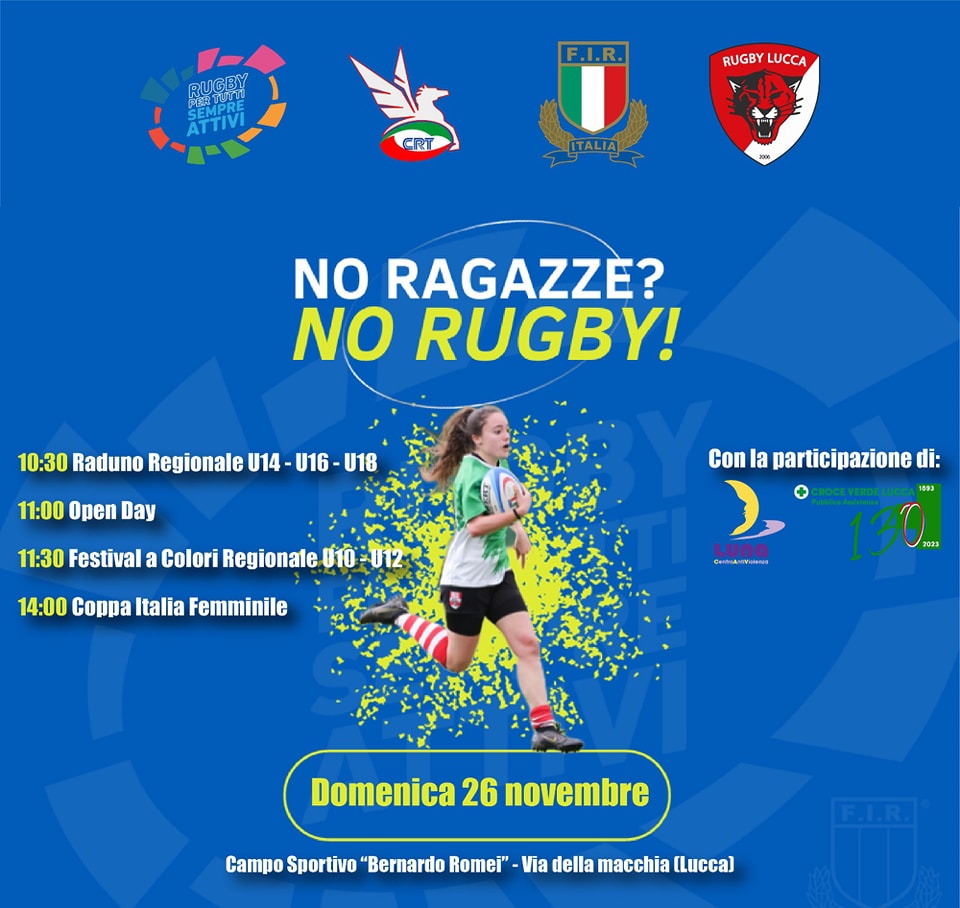 Il Rugby Lucca ospiterà il 26 novembre l'evento “No ragazze? No rugby!” una giornata dedicata al rugby femminile, voluta dalla Federazione Italiana Rugby a seguito delle indagini portate avanti dal progetto “Woman in rugby” per promuovere l'educazione nello sport e combattere qualsiasi forma di discriminazione, con particolare attenzione alla parità di genere.