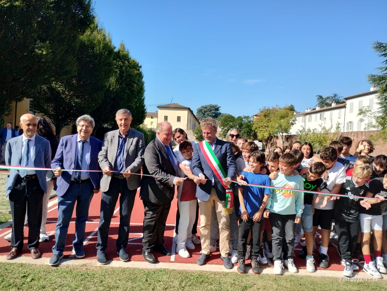 Il sindaco ha eseguito il tradizionale taglio del nastro sulla pista di atletica insieme al presidente Montinari, alle altre autorità presenti e agli alunni che lo hanno circondato festosi e coi quali si è intrattenuto per un po'.