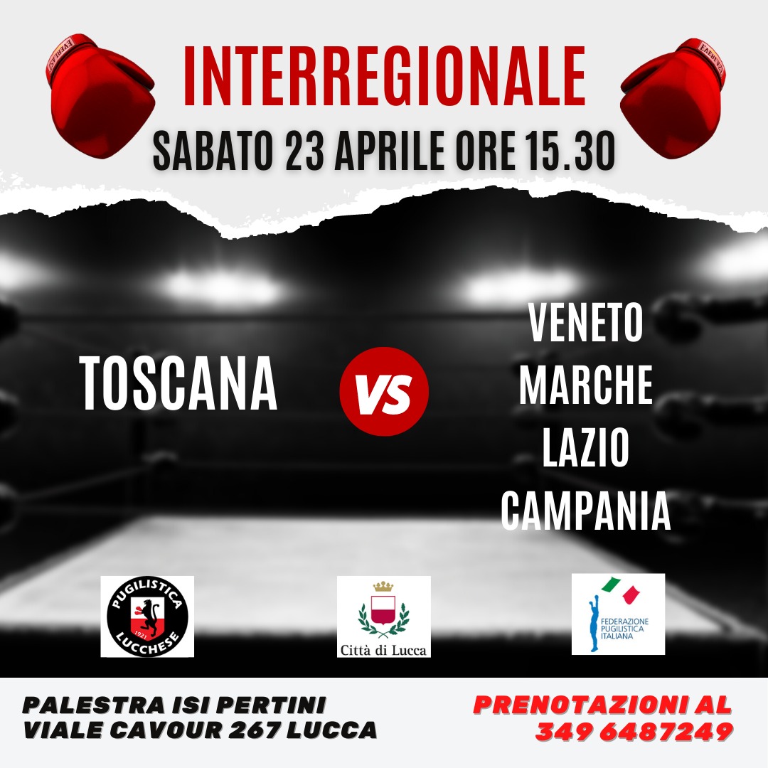 Interessante manifestazione di Pugilato quella che andrà in scena Sabato pomeriggio alle 15.30 presso la Palestra della Pugilistica Lucchese in Viale Cavour 267 a Lucca , una riunione di pugilato a carattere interregionale tra la rappresentativa del comitato regionale toscano della Federazione Pugilistica Italiana e una selezione mista di pugili provenienti dal Veneto, Emilia, Marche e Campania.
