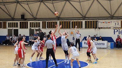 Primo quarto con le livornesi che tentano la fuga, la terza tripla al settimo minuto vede sul tabellone un eloquente 16-5, con le ospiti che non hanno ancora segnato dal campo. Ma i due sottoplancia di Valentino e la tripla di Cerkaska in 30 secondi le rimettono in partita (16-10). Cecchi al non fissa il risultato del primo periodo sul 18-10