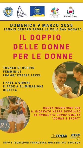 Un torneo tutto al femminile quello che si terrà domenica 9 marzo 2024, con inizio alle 9, al Centro Tennis Sport Le Vele di San Donato. L’evento è organizzato dal Soroptimist Club Lucca, guidato dalla presidente Laura Checcucci, in occasione della festa della donna, ed ha ricevuto il patrocinio del Comune di Lucca, sarà presente il vicesindaco Fabio Barsanti, e della Commissione pari Opportunità del Comune, con la presenza della presidente Rosella Simoncelli, infatti l’evento sarà inserito tra le iniziative proposte dall’Amministrazione in occasione della festa della donna. Il torneo, Fit-Tpra, coordinato dalla socia Francesca Molteni, sarà un'interessante occasione per fare sport e confrontarsi sul tema delle donne nello sport, progetto del Soroptimist Nazionale “Donne e Sport”. Importante anche il patrocinio del Centro Tennis Sport Le Vele di San Donato.“La parità tra donne e uomini – sostiene la presidente del Soroptimist, Laura Checcucci - è importate e deve trovare applicazione anche in ambito sportivo. Il progetto del Soroptimist si propone appunto di far riflettere su questo divario affrontando il tema della parità di trattamento di uomini e donne, così come la necessità di contrastare gli stereotipi e le discriminazioni sia in ambito professionistico che amatoriale. Vogliamo inoltre far riflettere sugli aspetti legati alla prevenzione della violenza nello sport, con un approccio inclusivo che consideri in ogni disciplina agonistica e non, anche la disabilità” . La gara, che vede già iscritte molte atlete del nostro territorio, vedrà scendere in campo le tenniste che si confronteranno nel doppio Lim 60/expert level, con una prima fase a gironi, mentre la seconda fase sarà ad eliminazione.