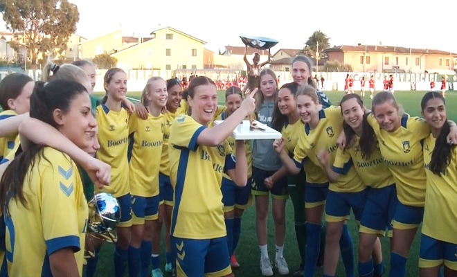 Il finale vede gli ultimi generosi assalti della formazione di Davide Corti che tenta in tutte le maniera di trovare la rete del pareggio. L’arbitro assegna tre minuti di recupero, ma il risultato non cambia più. E’ il Broendby a iscrivere il suo nome nell’albo d’oro del torneo dopo le due precedenti vittorie della Juventus. Gran festa nel clan danese e premiazione sul campo con l’Academy Porcari che consegna mazzi di fiori per la terna arbitrale e per le due capitane delle squadre. Il Sindaco di Porcari e il presidente Silla premiano le ragazze del Milan, poi il presidente del Cgc Viareggio consegna il trofeo al capitano Bruun.